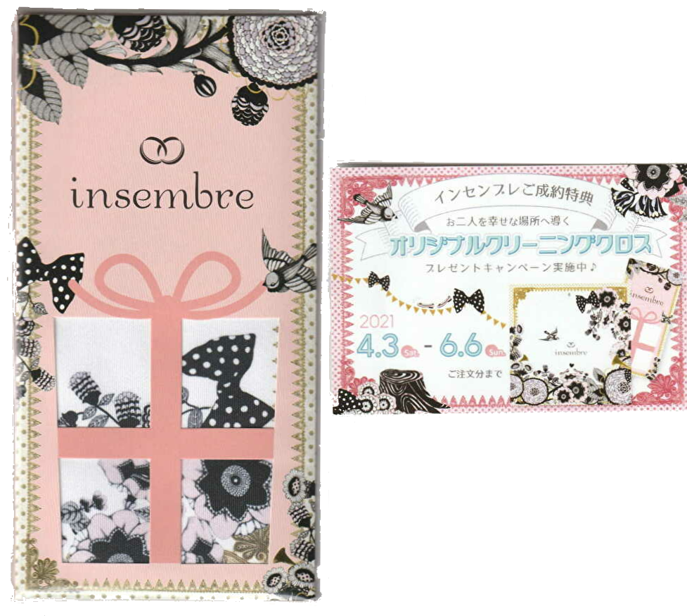 2021年4月3日(土)~2021年6月6日(日)までの期間中、インセンブレのマリッジリングをペアご成約で、とっても可愛いインセンブレオリジナル クリーニングクロスをプレゼント♪♪