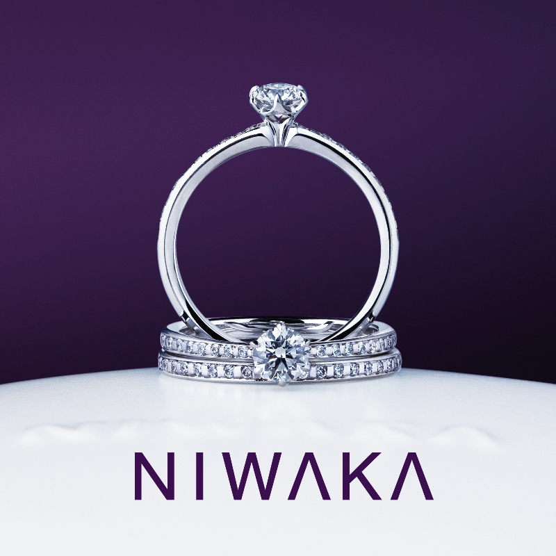 婚約指輪は華奢なアームが中央のダイアモンドを引き立て、まるで可憐な花のよう。結婚指輪は細く連なったメレダイアモンドが可憐な女性の指によく映えます。