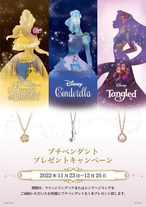 大人気のディズニー ブライダルコレクションから素敵なキャンペーンのお知らせです♪2022年11月23日(水)~2020年12月25日(日)までの間、ご婚約指輪(エンゲージリング)又はご結婚指輪(マリッジリング)をペアご成約で、シンデレラ・美女と野獣・ラプンツェルのご成約ブランドの可愛いペンダントをプレゼント!!ぜひ、この機会に利用してね♪