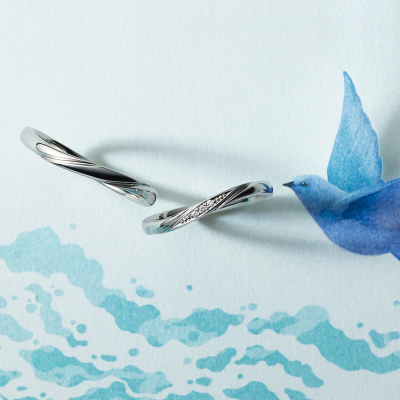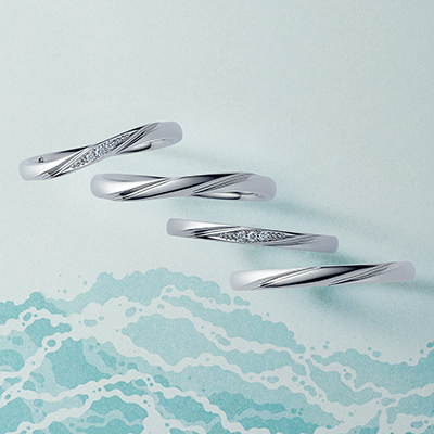 光り輝く海と青く澄んだ空のように、目の前に広がるふたりの未来。その穏やかな海辺に吹く風をイメージしたブライダルリングです。