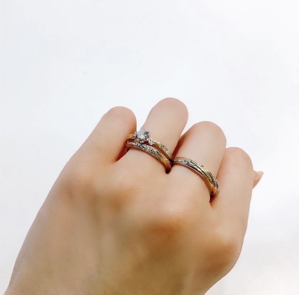 ③3色の金属が混ざり合っていくようなデザインは、2人が少しずつ仲を深め、気持ちが通い合っていく様子をイメージして。
