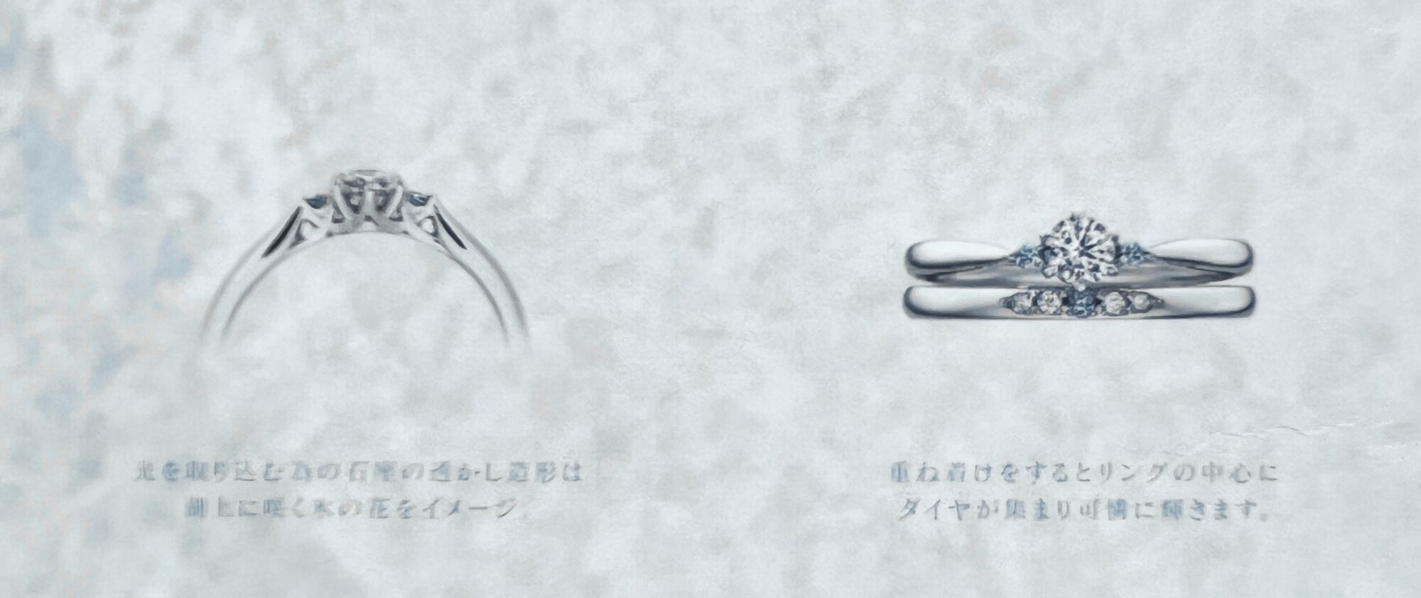 エンゲージリングの特徴:光を取り込む為の石座の透かしの形は、湖上に咲く氷の花をイメージしています。