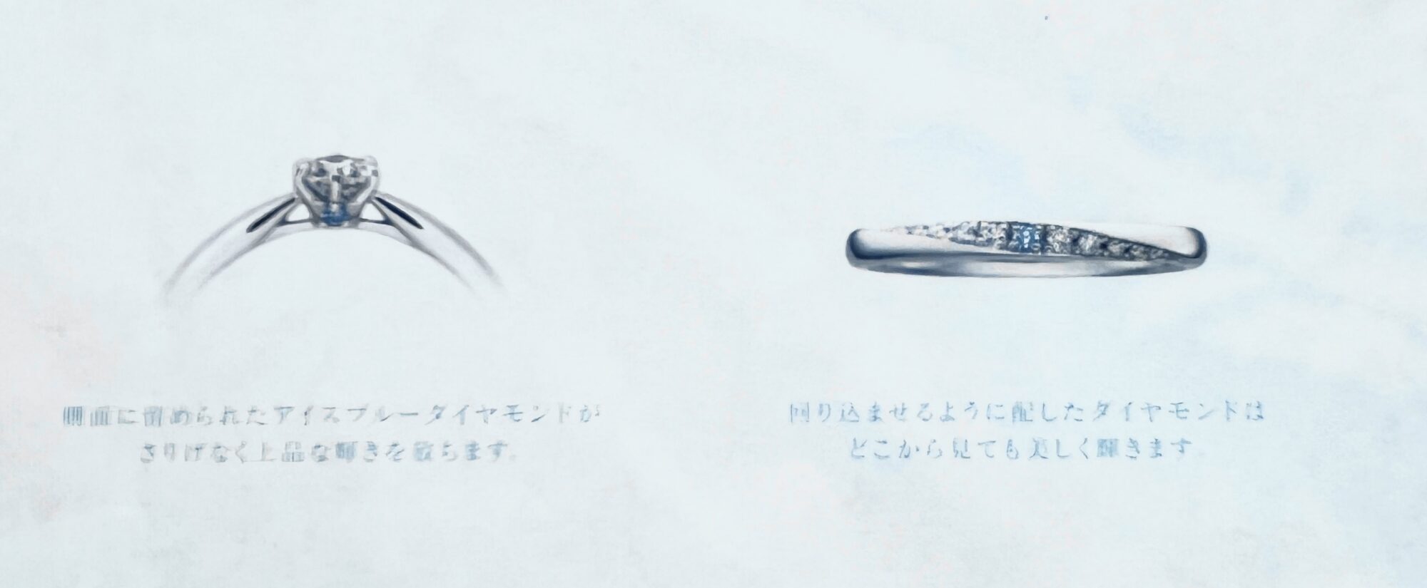 その神秘的な情景をイメージしてセッティングしたアイスブルーダイヤモンドは涼感溢れる美しいブルー。