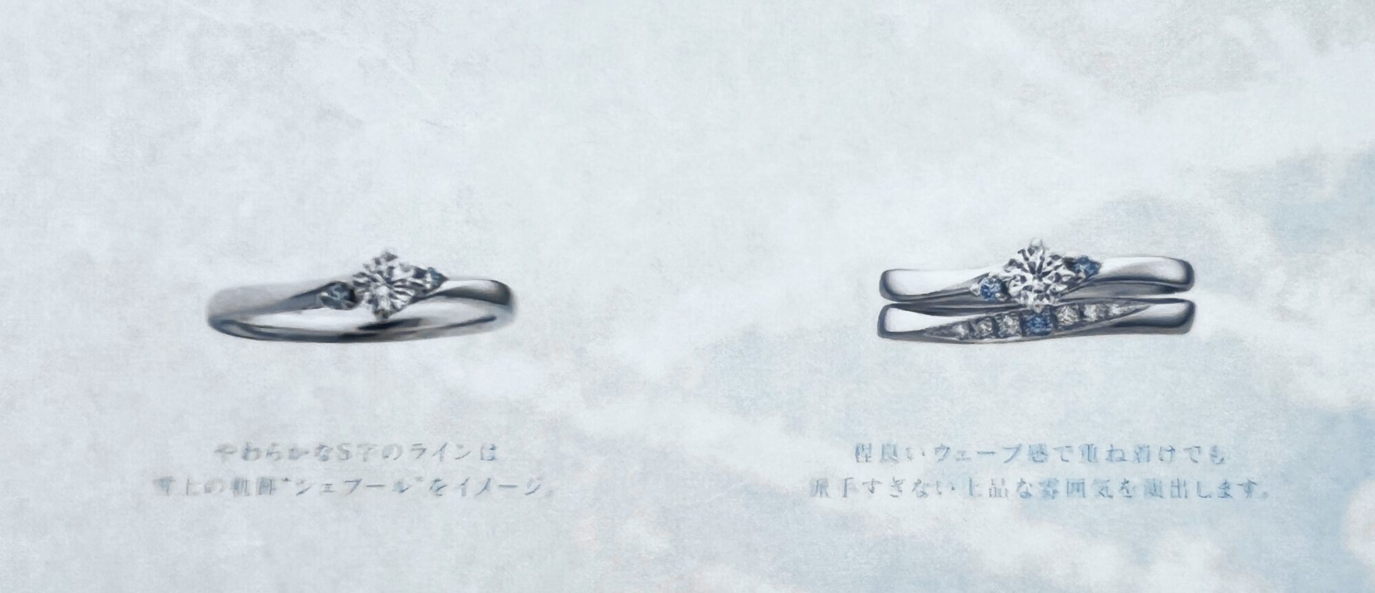 エンゲージリングの特徴:柔らかなS字のラインは、雪上の軌跡”シュプール”をイメージ。
