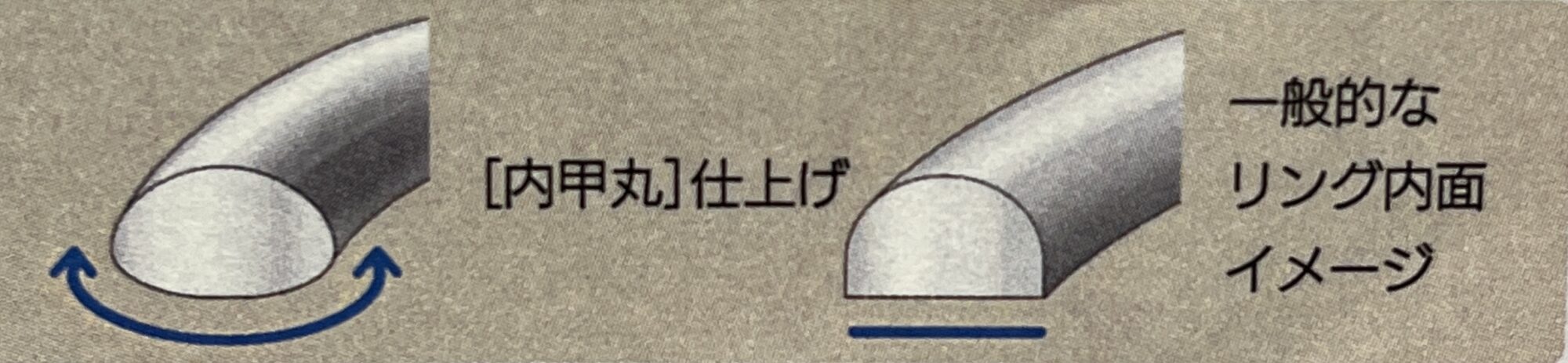 内甲丸とは・・・指輪の内側を丸くし、指との密着を少なくすることで非常に滑らかな付け心地をしています。