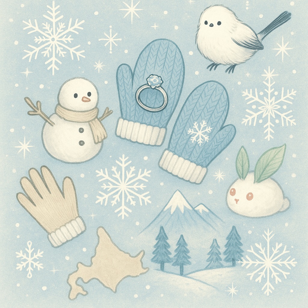 雪の結晶や雪山、シマエナガ、雪うさぎ、雪だるま、そして手袋――