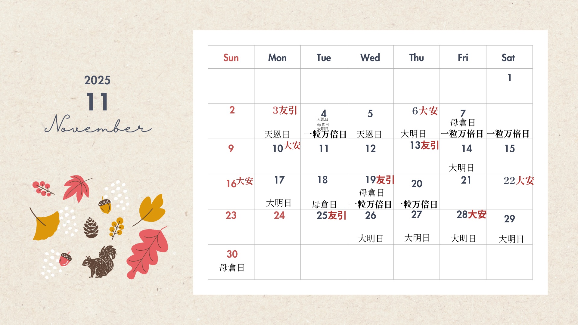 11月19日 友引+一粒万倍日+母倉日
