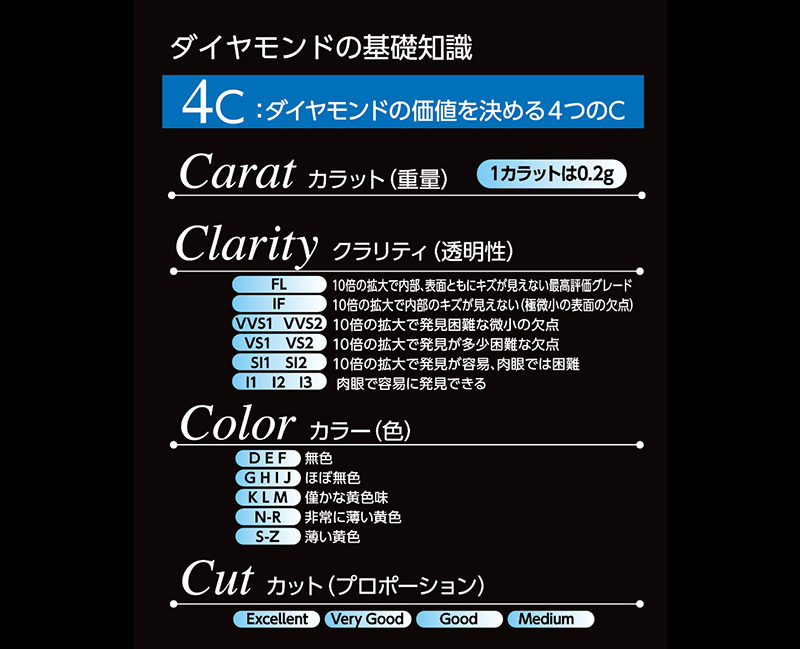 ダイヤモンドの品質を表す基準として使われるのが4Cと呼ばれる国際基準。