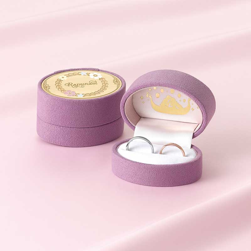 結婚指輪はラプンツェルの夢に対するまっすぐな気持ちをイメージしたデザイン。誕生日の夜空に放たれる光を見に行きたいというたったひとつの願いを1石のダイヤモンドで表現しています。