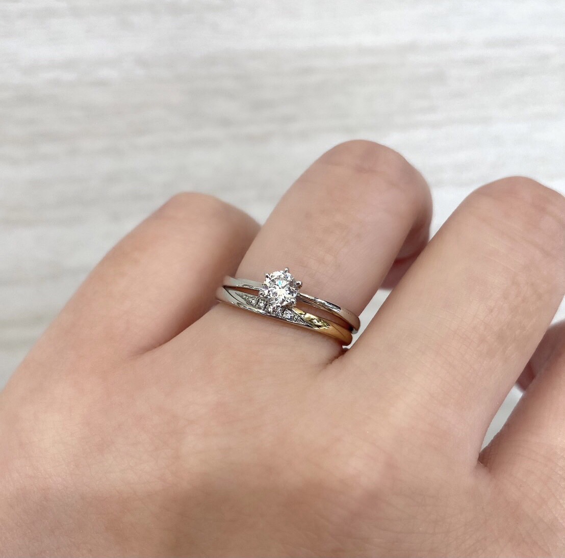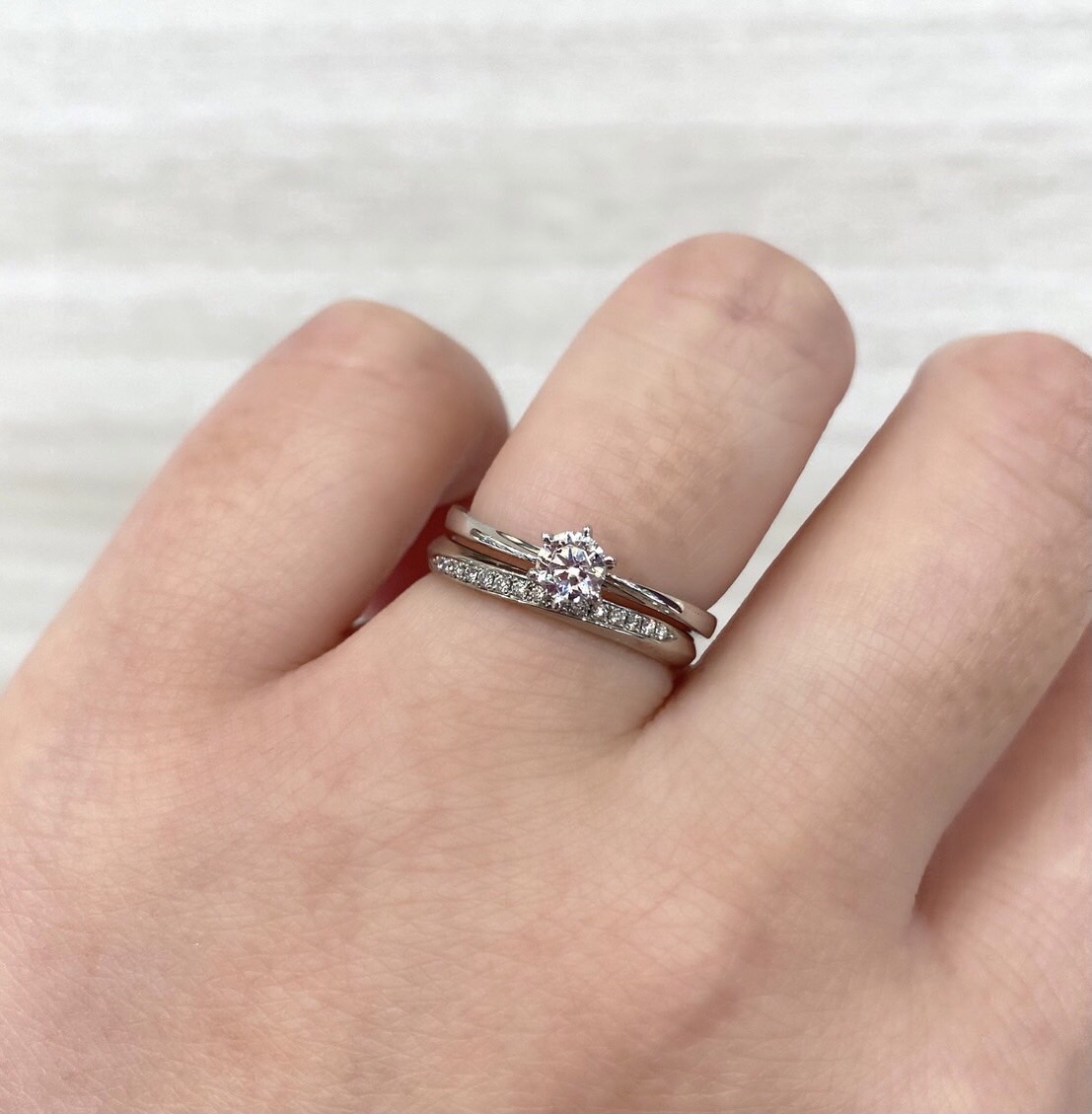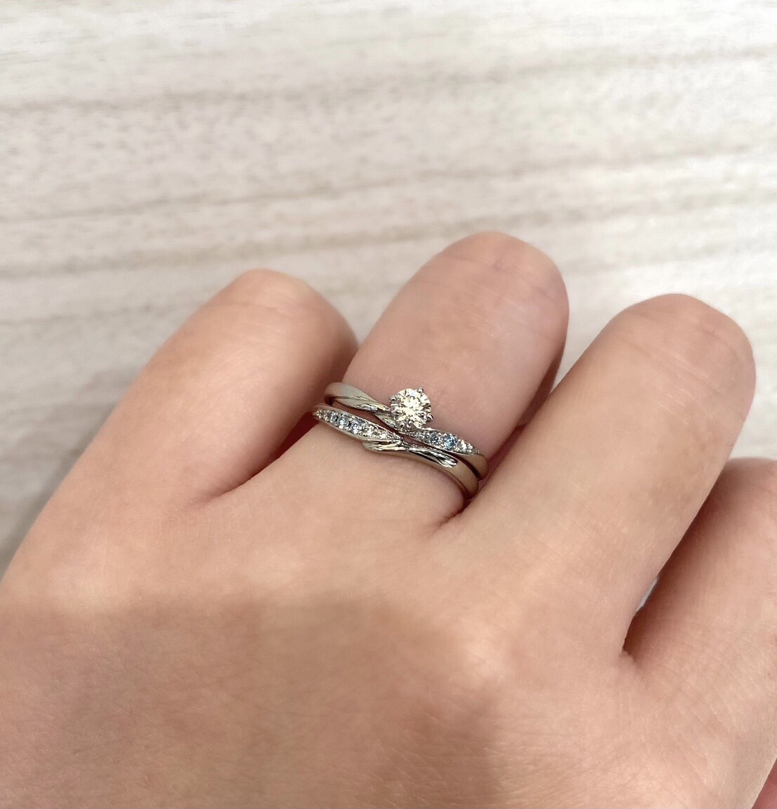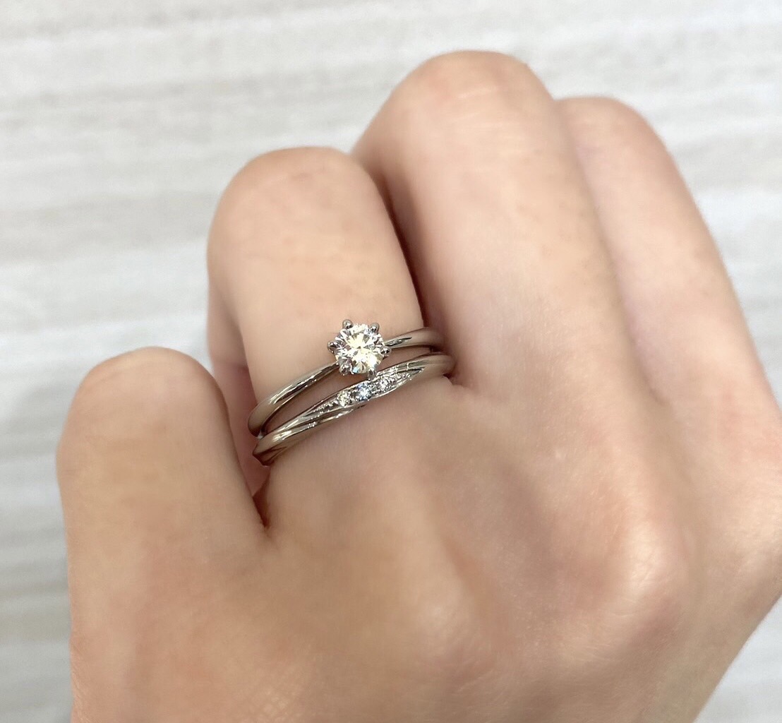 婚約指輪と重ね付けする結婚指輪は、必ず決まったセットリングというわけではなく二人のお好きな結婚指輪をお選びいただけます。ですが、重ねた時にピッタリと合うので是非ご結婚指輪選びのご参考にしてみてくださいね(^▽^)/