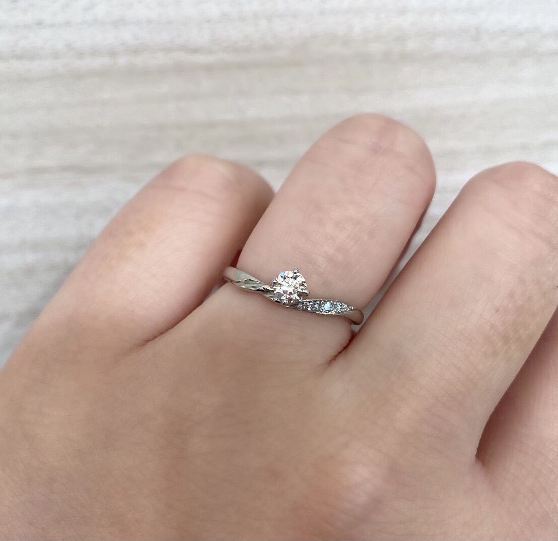 捻りのあるラインと、アシンメトリーなデザインが個性的な婚約指輪です。